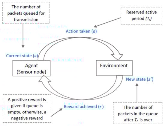 After transmitting a data packet, the sender waits for the data acknowledgment (DACK) from its receiver. If DACK is not received within a certain duration, the sender retransmits the data packet, thereby enhancing the reliability. In case of successful data transmission (i.e., DACK is received), at the sending end, the sender reserves its active time () to transmit its subsequent data packet(s) through the Q-learning algorithm. The sender considers the queue status, i.e., the number of packets queued for transmission as the initial state, chooses an active period (action) from the action space using the epsilon-greedy method, and sequentially transmits the next data packet(s) within the allocated active period. When the reserved active period is over, the sender observes its new queue status (new state). The new state actually represents the quality of the action taken. Based on the new state, a reward is given and Q-table is updated according to Equation (1). A positive reward () is given if the queue is empty; otherwise, a negative reward () is provided, as depicted in Figure 3.