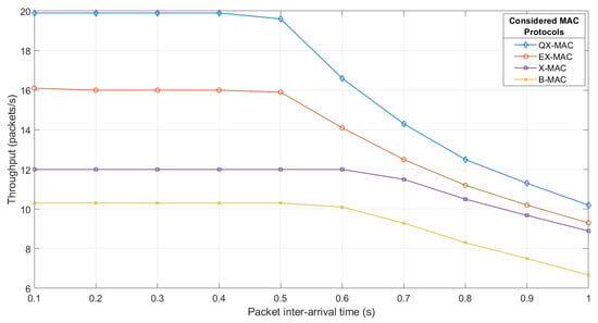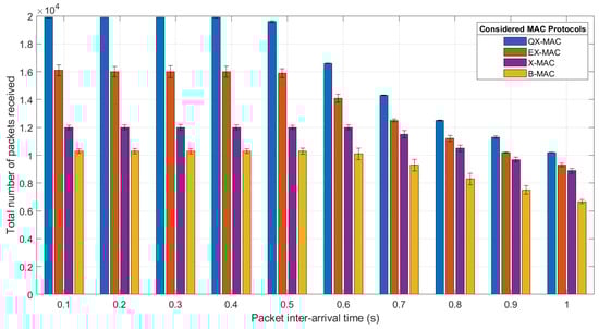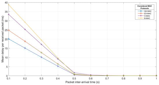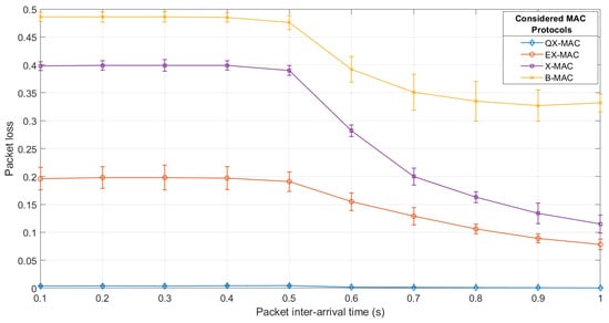 As observed in Figure 5, with QX-MAC, the server receives the maximum number of data packets for all considered packet inter-arrival times. The effect of the packet arrival rate on the network packet loss is shown in Figure 6. As seen, the network achieves the minimum packet loss with QX-MAC and the maximum loss with B-MAC. With all four MAC solutions, on average, the packet loss remains steady at a higher level until the inter-arrival time of 0.5 s; afterward it slowly decreases with the further increment of the inter-arrival time. Up to the inter-arrival time of 0.5 s, when the packet arrival rate exceeds the service rate (i.e., inter-packet arrival time > send interval), the network suffers from higher packet loss because of congestion. However, Figure 6 also clearly demonstrates that in the inter-arrival time range [0.1 s–1 s], on average, QX-MAC can carry 99.74% of traffic, while EX-MAC, X-MAC, and B-MAC can transfer a maximum of 92.18%, 88.5%, and 67.3% of traffic, respectively. This is due to the fact that in the synchronized state, QX-MAC enables the transmitter to directly transmit all of the data packets in line to the receiver; therefore, within the simulation time, more packets are delivered to the receiver. The retransmission mechanism and the methods used in QX-MAC to address the flaws in X-MAC design also contribute to the very low packet loss with QX-MAC.