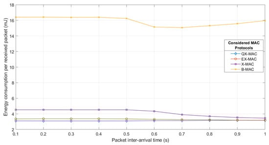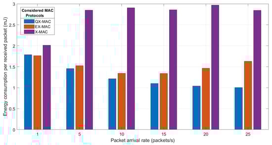 Figure 16 also demonstrates that for higher traffic loads ranging from 5 packets/s to 25 packets/s, among the three protocols, with QX-MAC, the network consumes the least amount of energy to deliver a packet to the sink. When the traffic gets heavier, although the total energy consumption (see Table 6) gets higher, QX-MAC consistently shows better energy efficiency (i.e., lower energy consumption per received packet) compared to EX-MAC and X-MAC because for all traffic rates, QX-MAC maintains significantly higher PDR (see Figure 15). Furthermore, it can be seen from the figure that as the traffic load increases, the per-packet energy consumption with the QX-MAC protocol decreases. The reason for this is that while the traffic load becomes heavier, more energy is consumed in transmitting and receiving rather than in idle listening. Regarding X-MAC, one may observe that at a higher packet arrival rate, X-MAC consumes similar energy, which is expected because with the increment of traffic loads, no improvement is seen in X-MAC in terms of the total number of received packets by the sink.
