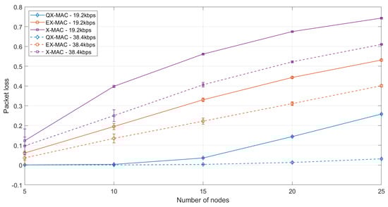 As seen in the figure, compared to the other two protocols, QX-MAC shows the minimum packet loss in all cases. At 19.2 kbps bit rate, with QX-MAC, the network experiences a very low packet loss (0.1%) when five nodes are considered. After that, the packet loss gradually increases when the network size grows. At 19.2 kbps, for 25 nodes, QX-MAC shows 51.41% and 65.27% lower packet loss than EX-MAC and X-MAC, respectively. At 38.4 kbps bit rate, the QX-MAC protocol provides a packet loss in the range of 0.12–3.17% while increasing the number of nodes. We observe that for all three protocols, at higher bit rate, the packet loss is lower. This is because if the bit rate is increased, packet transfer time (i.e., time to transmit a packet) decreases, thereby channel occupancy time becomes smaller, which in turn results in smaller packet collision probability, i.e., lower packet loss.