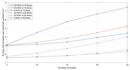The per-packet energy consumption graphs in Figure 11 depict that for all three protocols, the energy consumption per received packet increases with increasing nodes. When more nodes are in the network, more senders transmit packets, i.e., more energy is consumed in data transmission and reception; consequently, the network’s total energy consumption increases. Once again, it is observed from the graph that at 19.2 kbps bit rate, the QX-MAC protocol offers the best energy efficiency for all cases. At 19.2 kbps, on average, QX-MAC provides an energy savings of 10.54% and 34.97% over EX-MAC and X-MAC, respectively. At 38.4 kbps, QX-MAC outperforms X-MAC by 30.20% (on average). In this scenario, for 38.4 kbps, QX-MAC provides more energy savings than EX-MAC until 15 nodes, after which QX-MAC’s per-packet energy consumption is slightly higher than that of EX-MAC. Since QX-MAC implements a combination of DACKs and retransmissions of missing packets, it provides reliable communication at the cost of increased overhead, which has an impact on the overall energy consumption of the network at a higher bit rate with a bigger network size.