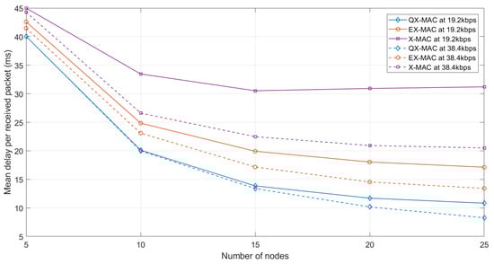 In the context of the delay metric, regardless of the data rate and the number of nodes, QX-MAC experiences a lower mean delay per received packet compared to the other reference protocols, as seen in Figure 12. Figure 12 also shows that the average delay of a packet decreases while increasing the number of nodes. With a lesser number of nodes, the queue length at each node as well as the contention delay become smaller; however, after waking up to send a data packet, the sender needs to wait until the sink is awake. With five sending nodes in the network, there is a higher probability that each node transmits a data packet in a cycle. As the number of nodes increases, both the queueing delay and contention delay increase since a sender needs to contend with more nodes to access the medium; and this leads to the higher probability that a node will have a longer queue. However, once a sending node obtains access to the medium and receives PACK from the sink, with QX-MAC, it is able to transmit all of its queued packets straightway until its queue is empty, thereby saving time in data transmission. Consequently, the average delay of all packets received by the sink increases very slightly with an increasing number of nodes. For QX-MAC, the average delay of all packets received by the sink lies in the range of [399.5–401.6] s for a network size of [5–25] nodes. Since with QX-MAC, the number of received packets significantly increases [see Figure A1] with more nodes in the network, the mean delay per received packet eventually shows a decreasing trend with an increasing number of nodes. X-MAC experiences the highest delay because it only operates in the unsynchronized state.