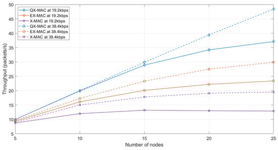 Figure 13 presents the throughput achieved by the three protocols with a different number of nodes in the network. We observe that apart from X-MAC at 19.2 kbps, each protocol’s throughput metric shows an increasing trend as the number of nodes increases. This is consistent with the delay metric shown in Figure 12 because when the delay decreases, the throughput should increase. In the considered scenario, when the network size grows, more packets are received by the server within the considered simulation time, which eventually increases the throughput. It is also seen from the figure that at 38.4 kbps, the throughput for each considered network size is higher than that of 19.2 kbps. At a higher rate, the time to transmit a packet decreases, so more packets can be delivered to the destination for the same simulation time. At both bit rates, X-MAC results in a very low throughput since it suffers from the drawback of higher packet loss with a larger number of nodes (see Figure 10). Irrespective of bit rates, QX-MAC clearly shows the highest throughput even when the number of nodes increases. Compared to EX-MAC and X-MAC, for the network size of 25 and at 19.2 kbps bit rate, QX-MAC improves the throughput by the factors of 1.59 and 2.88, respectively; and at 38.4 kbps, by the factors of 1.62 and 2.48, respectively.