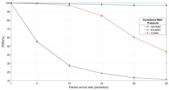 As shown in Figure 15, at a lighter traffic loads (at packet inter-arrival time of 1 s), the PDR for QX-MAC, EX-MAC, and X-MAC are 100%, 99.8%, and 99.7%, respectively. As the traffic loads become heavier, (i) X-MAC’s PDR results drastically fall; (ii) EX-MAC still outperforms X-MAC and retains an acceptable PDR level until packet arrival rate reaches 10 packets/s after which it gradually decreases; (iii) QX-MAC outperforms the other two protocols and maintains high PDR (around 100%) in all cases. It is observed from the figure that when the traffic loads increase, QX-MAC’s PDR performance only slightly degrades from 100% (at a packet arrival rate of 1 packet/s) to 97.2% (at a packet arrival rate of 25 packets/s), while for EX-MAC and X-MAC, network’s PDR declines to 43.4% and 11.2%, respectively. Therefore, it is apparent that in terms of PDR, X-MAC does not work well in multi-hop WSNs under high traffic conditions as it only operates in an unsynchronized state. The traffic-adaptive mechanism implemented in the QX-MAC protocol enables it to perform well under varying traffic loads.