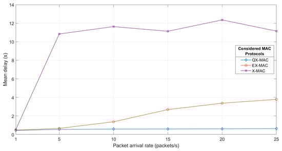 The mean delay of all packets received by the sink is shown in Figure 17. In this scenario, the end-to-end packet delivery delay is defined as the time difference between a packet is originated at the source and received at the destination. In Figure 17, we observe that compared to EX-MAC and X-MAC, the QX-MAC protocol experiences significantly lower mean delay irrespective of traffic loads. At the packet arrival rate of 1 packet/s, QX-MAC reduces the mean delay by 8.14% and 17.06% compared to EX-MAC and X-MAC, respectively. At higher traffic, QX-MAC results in a very slight increase in mean delay; and at the arrival rate of 25 packets/s, the mean delay experienced by QX-MAC is 83.43% and 94.37% lower than that of EX-MAC and X-MAC, respectively. For EX-MAC, as the traffic rate increases beyond 5 packets/s, the mean delay gradually rises, but still maintains the lower level than the X-MAC protocol. EX-MAC performs better than X-MAC in all cases because it employs the more bit scheme to deliver all the packets in the queue. However, EX-MAC cannot achieve the same level of delay performance as QX-MAC because in the synchronized state, whenever an EX-MAC node has more packets to transmit, it still spends extra time for at least one preamble-listen cycle. On the other hand, QX-MAC implements a combined approach of the more bit scheme and the Q-learning algorithm by which under high traffic loads, a QX-MAC sender in the synchronized state can directly transfer all of the data packets in line, thereby reducing delay. Regarding X-MAC, it is clearly visible from the figure that at higher traffic loads, X-MAC shows quite a poor delay performance.