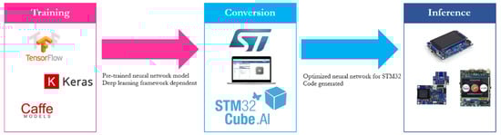 X-CUBE-AI is a package that extends the capabilities of STM32CubeMX.AI. It adds the possibility to convert a pre-trained NN into an ANSI C library that is performance optimized for STM32 microcontrollers based on ARM Cortex-M4 and M7 processor cores. The generated ANSI C source files are then compiled to run inference on the microcontroller. The generation process using this framework is depicted in Figure 2. In fact, CMSIS-NN kernels are used at a low level, but using this tool has a series of advantages for the developers such as: a graphical user interface, support for different DL frameworks such as Keras and TensorFlow Lite, 8-bit-quantization, and compatibility with different STM32 microcontroller series.