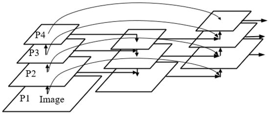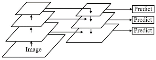 The main aim of feature fusion is to combine the features extracted from the image into a more discriminant feature than the input feature. The earliest feature fusion is to directly extract the features of the pyramid for prediction, without the fusion of multiple features [9], but the accuracy is relatively low in this case. Therefore, feature pyramid networks (FPN) [10] were proposed, as shown in Figure 1. A top-down connection is set up in FPN for feature fusion, and the fused feature graph with higher semantic information is used for prediction, which can improve the detection accuracy.