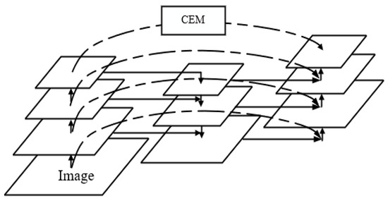 We combine the CEM module with the weighted feature mechanism and put the CEM module after the high-level feature map of the pyramid to obtain the enhanced feature fusion network structure R-FPN. The structure of R-FPN is shown in Figure 5.