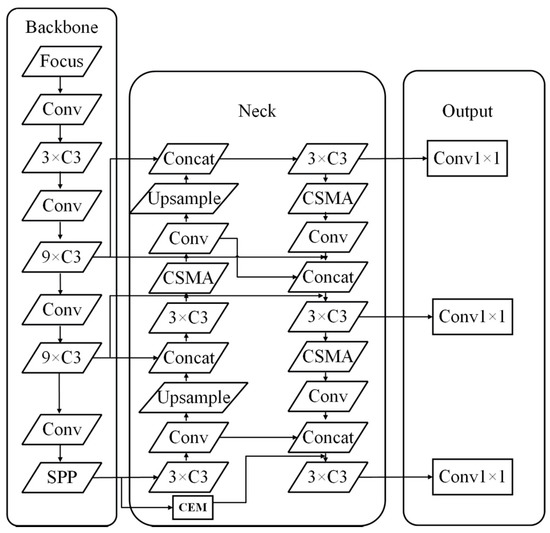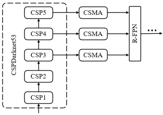 After that, all the sub-features are aggregated, and we use a “channel mixing” operation, which scrambles the feature map channel order so that cross-group information flows along channel dimensions. The final output of the CSMA module is the same size as X, making CSMA easy to integrate with modern architectures. Six hyperparameters , , , and (which has two hyperparameters) are introduced in the CSMA module, and the number of channels in each branch of a single CSMA module is . As a result, the total number of parameters is ( usually uses 32 or 64), which is trivial compared to the millions of parameters in the entire network. In this paper, the CSMA module is built on the backbone network structure of CSPDarknet53, and the model structure is shown in Figure 7.
