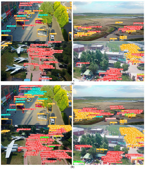 Test results comparison of the YOLOv5 algorithm: (a) The detection results of the original YOLOv5 algorithm; (b) The detection results of the proposed YOLOv5 algorithm.