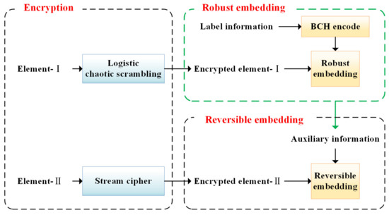 In this section, the multi-domain embedding framework in encrypted videos and the anti-recompression RDH-EV scheme based on the framework are elaborated. The framework is shown in Figure 1. To achieve commutativity, data hiding and encryption usually avoid interference by modifying different attributes of the same element. In this framework, the element for robust embedding is encrypted through Logistic chaotic scrambling, which is marked as element-I. To further improve robustness, the label information will be encoded with BCH (7, 4, 1) [27,28]. Then, the label information will be robustly embedded into element-I by modulating the amplitude of element-I, in which the auxiliary information is generated for recovering the element-I lossless. The element for reversible embedding is marked as element-II, the sign of which will be encrypted by stream cipher. The auxiliary information will be reversibly embedded into element-Ⅱ through traditional HS.