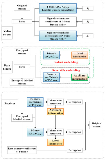 The scenario flow of the proposed scheme is shown in Figure 2. The scheme is mainly divided into three parts: video encryption, data embedding in encrypted video and data extraction and video recovery. In the video encryption phase, the video owner selectively encrypts elements of the original video bitstream using Logistic chaotic scrambling and the ZUC algorithm. In the data hiding phase, the data hider embeds the label information and the auxiliary information into different encrypted elements. The data hider can be a cloud service or the video owner, depending on the actual application scenarios. In the data extraction and video recovery phase, the authorized receiver extracts the information and fully recovers the original video bitstream.