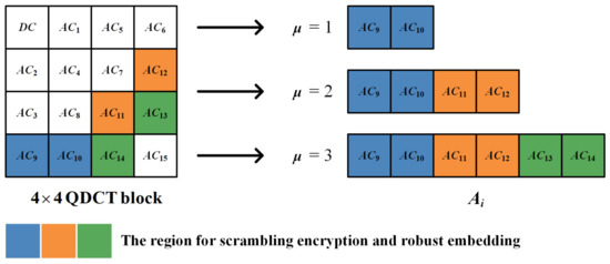 In this paper, partial QDCT coefficients of I-frame are chosen as element-I. As shown in Figure 3, the partial AC coefficients, AC9-AC9+μ of a 4 × 4 QDCT block in non-first rows and non-first columns of an I-frame, are divided into a group, assuming Ai = (a1, …, aμ, aμ+1), where i = 1, …, n−1, n; n is the number of QDCT blocks available in the I-frame for embedding; μ ∈ {1, 3, 5} is a robust embedding capacity parameter; and the default μ = 1 in this paper. Suppose M = (A1, …, An−1, An). Then M will be encrypted with key K.