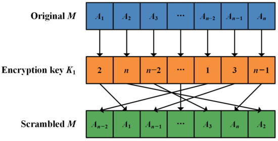 (1) Given λ and x0, the scrambling key K1 is obtained according to the Logistic chaotic scrambling algorithm. Then, M is encrypted with K1, as shown in Figure 4. In this way, the encrypted domain for robust embedding is formed. Note that λ and x0 will be reversibly embedded into the P-frame as part of the auxiliary information.