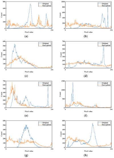 Histogram of original and encrypted frame. (a) container, (b) foreman, (c) salesman, (d) mobile, (e) carphone, (f) news, (g) city, (h) coastguard.