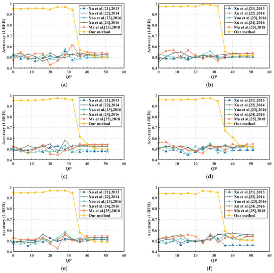 Robustness refers to the anti-interference ability of the data hiding algorithm. The robustness of a scheme is evaluated by its extraction accuracy (1-BER) under attacks. The higher the accuracy, the stronger the robustness. In this experiment, the representative algorithms [21,22,23,24,25] are selected for a comparative experiment. For consistency, all algorithms are tested in I-frame. Figure 8 compares the extraction accuracy (1-BER) of the proposed algorithm and the representative algorithms. As seen from the figure, the proposed scheme outperforms the compared schemes in terms of robustness. The proposed algorithm can achieve an accuracy more than 90% under low QP re-compression attacks, while the accuracies of the algorithms in [21,22,23,24,25] fluctuate around 50% in eight test sequences. Although the BCH code is used in [23], the algorithm cannot resist a re-compression attack, like the other four algorithms. This is because the embedding algorithms used in [21,22,23,24,25] are all traditional HS, with which the information needs to be extracted on accurate amplitudes (i.e., 1 and −1). Once one of the accurate amplitudes is quantized to 0 under the re-compression attack, it will affect the extraction of not only the current bit, but also the subsequent bits. As a result, most of the extracted information will be wrong and the BCH code will be unable to work. In the proposed algorithm, the information is extracted by distinguishing the positive and negative of d′. For example, although the coefficient pair (2, 1) containing bit ‘1’ is quantized to (1, 0), the correct bit ‘1’ can still be extracted according to Equation (10). Moreover, the embedding and extracting area is fixed, and the extraction error of any bit will not affect the extraction of other bits. Therefore, the proposed algorithm can better resist the re-compression attack.