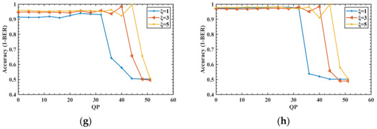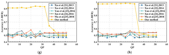 Extraction accuracy (1-BER) comparison between our method and the current methods [21,22,23,24,25] (original QP = 28). (a) container, (b) foreman, (c) salesman, (d) mobile, (e) carphone, (f) news, (g) city, (h) coastguard.