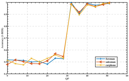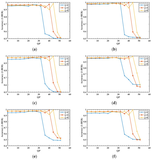 Table 2 displays the robustness of the proposed algorithm and the accuracy of label information extracted from the labeled video under different QP re-compression attacks. Under the re-compression attack, some small QDCT coefficient pairs will be quantized to (0, 0) in the re-compression with large QP, so the information embedded in them may be lost. As can be seen from Table 2, when ξ = 1, it is difficult to resist the re-compression attack with QP ≥ 36. This is because the proposed algorithm mainly uses the medium and high frequency coefficients, most of which are small. When the re-compression QP is large and the parameter ξ is small, the labeled QDCT coefficient can be easily quantized to 0. When ξ ≥ 2, the proposed algorithm can be effective against large QP re-compression attacks. Figure 9 displays the relationship between ξ and the ability to resist re-compression attacks. Obviously, the larger the ξ, the stronger the ability to resist re-compression attacks. That is because the larger the ξ, the larger the modified coefficient. A large coefficient is difficult to quantize to 0 so the information can be extracted correctly under a considerable degree of re-compression attacks. Figure 10 displays the extraction accuracy of foreman, salesman and carphone video sequences with different original encoding QP values under a QP = 40 re-compression attack. It can be seen that the larger the original encoding QP value, the larger the re-compression QP value that can be resisted. When the original encoding QP ≥ 32, it can effectively resist the QP = 40 re-compression attack. As seen from Figure 8, Figure 9 and Figure 10, the proposed scheme not only outperforms other schemes in terms of robustness but also can adapt to the robustness requirements in different scenarios by setting ξ and original encoding QP.