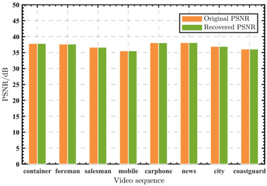 Figure 12 displays the original PSNR of video sequences and the PSNR of video sequences after information embedding and extraction. The PSNR of two situations corresponding to each video sequence are seen to be consistent. That is to say, the proposed scheme can fully recover the carrier and is reversible.