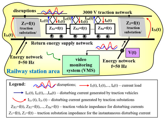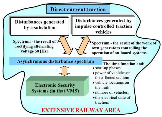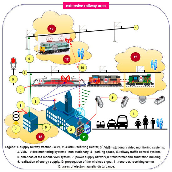 An extensive railway area experiences a distorted electromagnetic environment generated by stationary (radio transmitters and TV transmitters, GSM-R, power supply and overhead contact network, etc.) or non-stationary (electric multiple units, rail carriages, portable security system transmitters, etc.) radiation sources [27,28]. Electromagnetic radiation within a railway area is generated intentionally—e.g., wireless signals of security systems, cellular telephony such as GSM—these signals will be used by authorized railway services. Other sources generate unintentional electromagnetic radiation—e.g., power supply, railway overhead traction lines, high current and voltage consumers—e.g., traction converters, locomotive motors present within these areas [29,30]. Electromagnetic interference generated within a railway area is characterized by a very broad spectrum, from low (single Hz) to very high (single GHz) frequencies. This is due to this railway system accumulating various sources of radiation used by railway workers, as well as power supply and overhead contact line systems used by the pantographs of electric locomotives to draw high-value current (in the order of several dozen kA) upon startup for a short period. It is a serious problem related to the distortion of the electromagnetic environment within such a railway area. Therefore, conducted and radiated interference shall be considered [31,32,33]. The selected aforementioned issues of ESS and VMS operation throughout an extensive railway area are presented in Figure 1.