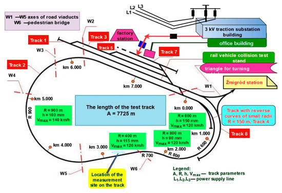The electromagnetic compatibility tests discussed in the article were conducted at the Railway Institute Test Track located near Żmigród, as shown in Figure 4. It is a curvilinear, closed, circular and 7725 m long track. It has a straight section of more than 1 km, which enables testing the dynamic behaviour of rail vehicles, with a rail track speed limit equal to 160 km/h, as shown in Figure 4.