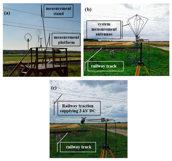 Figure 8 contains photographs—of the appearance of actual measurement stands located within the Railway Institute Test Track. On the other hand, Figure 4 marks the location of electromagnetic compatibility tests within the range of radiated interfering signals. The measurement point satisfies the requirements set out in the standard covering the measurement methodology. Failure to meet this requirement means unintentional changes to the original electromagnetic field “signature”.