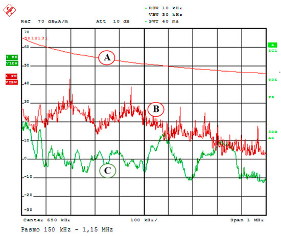 Figure 9, Figure 10, Figure 11, Figure 12, Figure 13 and Figure 14 show interfering signal spectra for different frequency ranges obtained during the measurements. These figures illustrate two different spectrum waveforms within the discussed frequency subranges and permissible values for a given frequency range, as set out in the PN-EN 50121-3-1 standard. Figure 9 illustrates the spectrum of interfering signals radiated by a rail vehicle travelling at 50 km/h for a frequency range of 150 kHz–1.15 MHz. The waveform values obtained during the measurement are shown in all Figures using different waveform colours and appropriately marked using the letters A, B and C:
