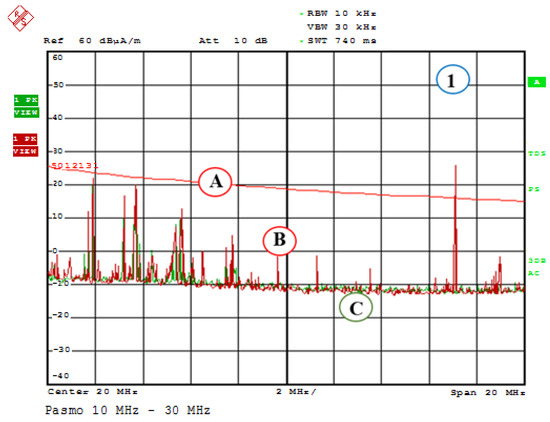 The signal spectra for a frequency range of 10 MHz–30 MHz shown in Figure 9 indicate that the interfering signals radiated by a traction vehicle travelling at a speed of 50 km/h (marked as B) exceed the permissible values set out in PN-EN 50121-3-1. This exceedance is evident for a frequency range of 27.09 MHz and results from the operation of an ETCS transmitter (vehicle antenna, European Train Control System track)—marked in Figure 11 as 1. Please note the clustering of individual spectral lines around the frequencies that are characteristic of a travelling vehicle. It can be observed that the interfering signal level of a travelling rail vehicle increased only slightly (relative to background measurement), e.g., an interfering signal change to 38.4 dBµA/m was observed for a frequency of 27.09 MHz. Table 4 shows the background and travelling vehicle measurements for a signal spectrum, where the electromagnetic field strength increase is the highest.