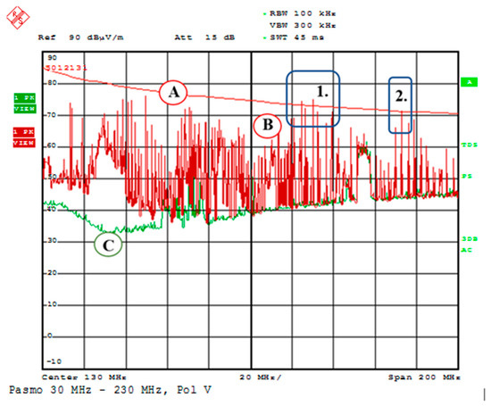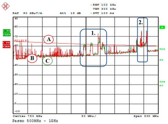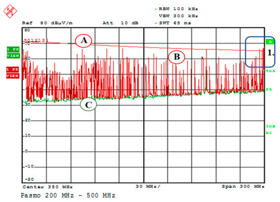 The spectra for the frequency range of 200 MHz–500 MHz in Figure 13 clearly show changes in the values of radiated interfering signals for a traction unit moving at a speed of 50 km/h (marked as B). However, the permissible value specified in the standard is shown to be exceeded only at the end of the analysed spectrum analyser band, which is marked in Figure 1 as 1. Exceeding this value is particularly evident at a frequency of 495.88 MHz (Table 6).