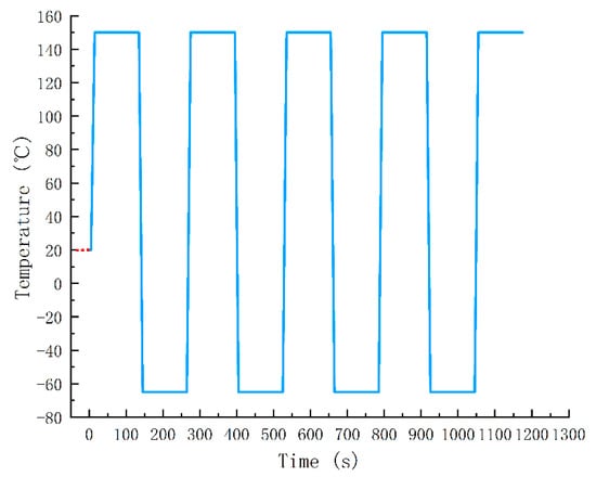 As shown in Figure 2, according to the standard GJB548B, the high and the low temperatures in the thermal shock test are set to 150 °C and −65 °C, respectively. The switch time and the residence time are 10 s and 2 min, respectively. This means that one fatigue cycle is 250 s. After 800 cycles, the 3D packaging memory device is electrically tested at the room temperature. If the failure occurs, sample preparation will be carried out. Otherwise, the thermal shock test is repeated for 100 times, and then the electrical test is subsequently carried out until the device fails.