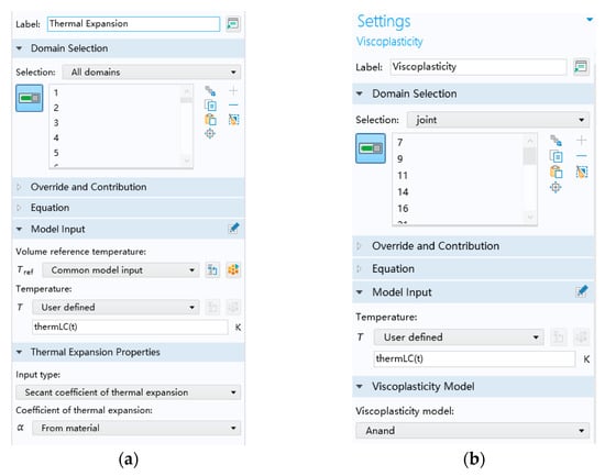 To simulate the deformation of the device under thermal shock, the thermal expansion module is involved in its finite element model. In the thermal expansion simulation, all domains are selected for Domain Selection and the temperature function shown in Figure 2 is imported into the temperature model. In addition, the viscoplastic module is involved in the model, in which the Anand model is selected. Additionally, solder joints are selected for Domain Selection in the viscoplastic module, and the temperature function shown in Figure 2 is imported into the temperature model. These settings of the thermal expansion module and the viscoplasticity module are shown in Figure 5.