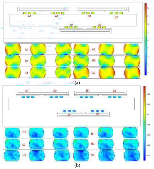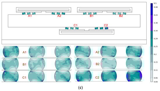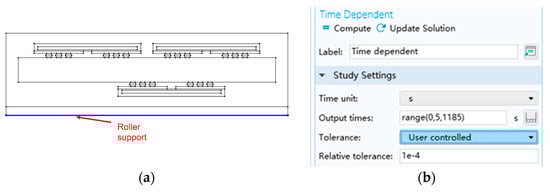 As illustrated in Figure 6, the constraint of the roller is imposed on the lowest layer of the device. After the settings of finite element model are completed, the finite element analysis is conducted with the time dependent. Specifically, the range (0, 5, 1185) is selected for Output times. That is, the calculation starts from 0 s, the results are output after each 5 s, and the calculation ends after 1185 s.