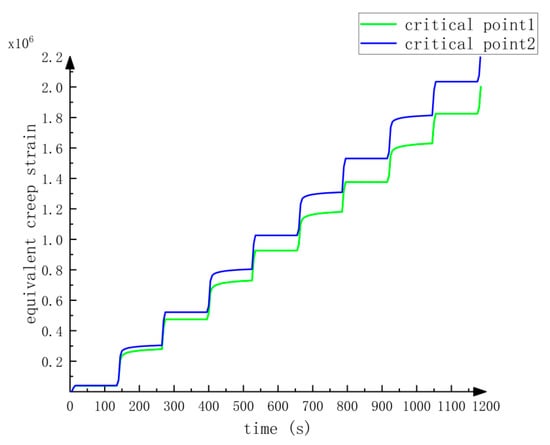Figure 8 shows the equivalent creep strain and shear creep strain components at the two critical points of the device. As indicated in Figure 8, the creep of the solder joint increases with time. When the temperature changes sharply, the creep increase rate of the solder joint becomes fast. When the temperature remains unchanged, the creep of the solder joint increases slowly.
