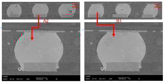 In order to study the microstructure changes during the thermal shock test, a cross-sectional study is carried out inside the 3D packaging memory device. Figure 9 shows the SEM micrographs of cross-sections of the solder joints among A2 and B1 solder joints, which are not damaged or subtly damaged after 1400 thermal shocks. It can be seen that parts of solder bumps have good shapes and are firmly bonded to the metallized PCB side of the bumps and the chip coating. There are some small defects on the edge of the solder joint. Additionally, a small number of cracks or crack initiation emerge on the edge of the solder joint, while there is no large void inside the solder joint.
