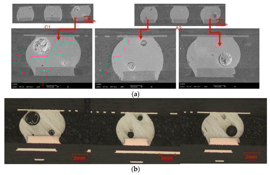 Figure 10 illustrates the SEM micrographs of cross-sections of the solder joints among A2 and C1 solder joints, which are damaged after 1400 thermal shocks. As shown in Figure 10, there is a void in each solder joint, whose diameter is 120–140 μm. Voids are caused by the amount of outgassing flux entrapped in the solder joint during reflow [24]. Voids larger than 50% of the solder joint area will lead to potential reliability problems, resulting in a 25–50% reduction of the solder joint life in the mechanical test [25]. Notably, when several small voids emerge on one side, they will affect the reliability of the solder joint. Additionally, the location of the void influences the life of the solder joint. Specifically, if the void is located on the component side of the solder joint, it may accelerate the failure due to the reduction of the crack growth distance. With the increase of the number of thermal shock tests, the crack will grow inward in various directions.