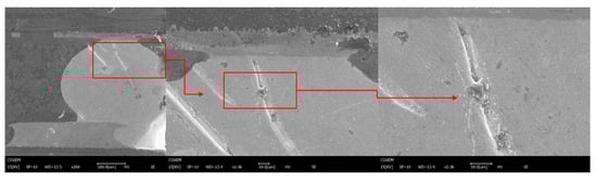 The soldering position shift occurs at the inner edge of the C2 area in the device, resulting in a small contact area between the solder joint and the copper sheet. As observed by the electron microscope, many large cracks emerge in the solder joint, which are distributed at the corner solder bumps between the chip side and the packaging side. As shown in Figure 11, cracks or dents emerge on both sides of the solder joint. The cracks can be found near the interface between the solder joint and the PCB and grow to almost the entire cross-section of the solder joint through the void inside the solder joint. The maximal length of the crack exceeds 0.3 mm.