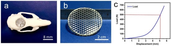 (a) A resin rat skull sample made by 3D printing technique with resin. In the middle of the top surface, a curved, 3D-ptinted circular Ti cranial window was fitted. Adapted with permission from Ref. []. 2022, Nana Yang et al. (b) Optical photograph of a 50 mm diameter, net-like Ti-PDMS cranial window. The circular Ti frame with thin hexagonal grids was firstly 3D-printed, polished, and then covered with a PDMS layer. (c) Raw data of mechanical test for one 50 mm diameter Ti-PDMS cranial window. It needed a static force of 500 N perpendicular to the Ti-frame at the center to let the central region show a 5 mm displacement.