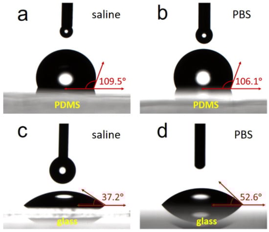 Contact angle measurements for PDMS and glass cover slide. (a) Saline on PDMS. (b) PBS on PDMS. (c) Saline on glass slide. (d) PBS on glass slide.