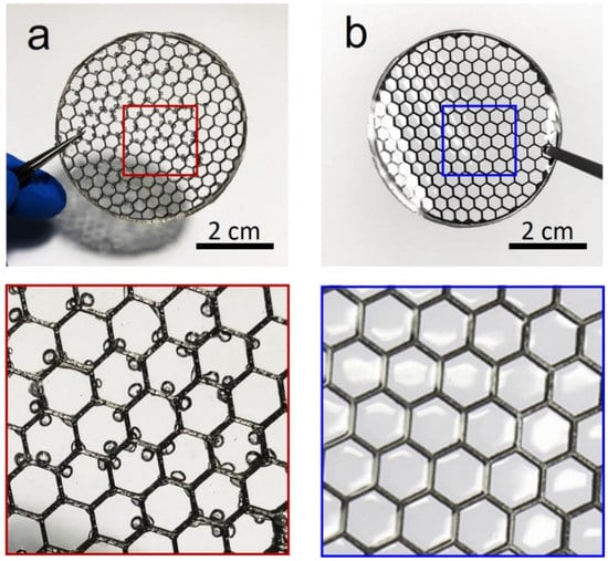 When coating the polished Ti honeycomb frame with PDMS, some small bubbles were likely to remain in the as-made PDMS windows, as shown in Figure 4a. We have developed a multistage process, where the samples were continuously shaken and degassed with certain equipment, and clear Ti-PDMS samples were obtained without noticeable bubbles, as shown in Figure 4b.