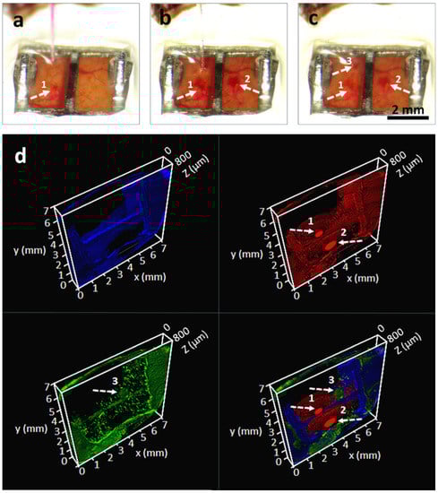 In the wavelength range of 380–1100 nm, PDMS layer (0.3–0.5 mm in thickness) showed a higher transmittance than that of #1 glass coverslip. Therefore, our small-size Ti-PDMS transparent cranial windows implanted in mice allowed excellent two-photon imaging results []. The excellent plastic nature of PDMS was utilized to perform multiple injection of drugs using commercial 1 mL syringe through the same unit window of PDMS on a honeycomb Ti frame. For continuous injections by 15 times, no leaking of the injected liquid was observed. Figure 5 showed a typical result after injection of DiI (0.1% methanol in water, 0.2 µL, 0.1 µL min−1) and fluorescence dye CTB488 (1 mg ml−1 in PBS, 0.2 µL, 0.1 µL min−1) at three different spots of a mouse cortex through an implanted Ti-PDMS cranial window. No leaking was observed after the injections. Two days later, confocal imaging experiments were performed at the injection region. As shown in Figure 5d, the three injection spots were clearly observable, and fluorescence dye was recorded in deeper tissues around the injection spot [].
