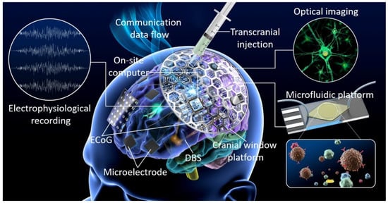 For instance, Neuralink Co. has demonstrated that a brain–computer interface mounted in the skull of a pig or a monkey, with the size of a quarter coin, and consisting of built in processing chips, circuits and battery, could collect the real-time neural signals of the animal through thousands of microelectrodes implanted in the brain cortex []. This could be considered as a simple prototype of a smart cranial electronic device.