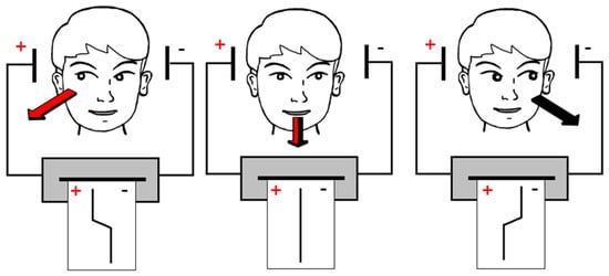 In this study, two bio-signals, EOG and EMG, were used as inputs for HCI. A constant potential exists between the cornea and the retina due to the difference in metabolic activity. This potential is maintained when the gaze is fixed, and when the eyeball is moved, the potential changes, as shown in Figure 1.