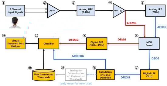 In terms of bio-signals transmission, the blue arrows indicate the flow of EOG signals, and the red arrows indicate the flow of EMG signals, respectively. In this study, the bio-signal-based HCI system was composed of four parts: electrodes, an analog circuit board for bio-signal acquisition (①–⑤), an MCU board for A/D conversion and serial communication (⑥), a software module for feature extraction and signal classification (⑦–⑫), and an HCI test module (⑬). For EOG and EMG signal acquisition, two electrodes were located at both sides of the bone conduction headphones, respectively, and the ground electrode was located at the back of the user’s neck. The EOG signals from the horizontal eye movement and the sEMG signals from the biting operation were measured through the electrodes attached to the bone conduction headphones. The signal acquisition board was composed of two-stage analog amplifier and analog filters for noise removal and separation of EOG and EMG signals. For A/D conversion and serial communication of analog-filtered EOG (AFEOG) and analog-filtered EMG (AFEMG) signals, an NXP FRDM-KL25Z MCU board was used. Then, digitized EOG (DEOG) and digitized EMG (DEMG) signals from the MCU board were transmitted to the PC for feature extraction and classification of eye gaze direction and angle. To enhance the feature extraction and classification performance, software-level additional digital filters were used. Using the digital filtered EOG (DFEOG) signals, the features were extracted by a moving average filter-based deviation calculation. Then, the moving average filtered deviation of EOG (MFDEOG) signals was fed into the classifier. To remove the noises and to obtain the effect of a biting operation from the DEMG, the software level bandpass filter was used and the digital filtered EMG (DFEMG) signals were also fed into the input of another classifier for classification of the biting operation. The details of each block are described later in this paper.