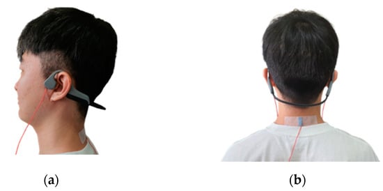 Typically, to obtain horizontal EOG signals, electrodes are attached near both eyes and the potential difference is measured and amplified for signal processing. However, it is difficult to use these in practical applications due to the inconvenience of the measurement environment according to the position of the electrodes. To overcome this usability problem, we developed a bio-signal acquisition system that can measure the bio-signals at the electrodes integrated into the bone conduction headphones. The position of the electrodes is shown in Figure 3.