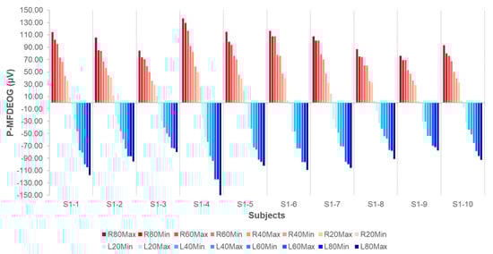 Through the experiment, it was confirmed that just as the value of the horizontal EOG changed according to the rotation angle of the eyeball, the value of the MFDEOG signal also changed according to the rotation angle of the eyeball. However, similar to EOG, MFDEOG did not show the perfect linearity in the rotation angle of the eyeball, and the value of MFDEOG was slightly different depending on the subject, as shown in Figure 6b. Figure 7 shows the maximum and minimum of the p-MFDEOG of 10 subjects who participated in the first experiment of this study for each position of eye gazing.