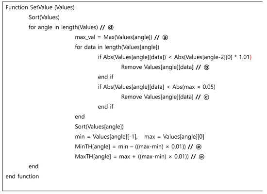 where Vmax and C represent the asymptotic peak velocity and a constant, respectively. According to this equation, the peak velocity increases linearly from 0 to 15°, but above it, the velocity is saturated with a constant value. Therefore, within the range of eye movement targeted in this study, it was not necessary to consider the variation of eye speed according to the angle of saccadic eye movement. Figure 8 shows the pseudo-code of the “SetThValue” function that found the threshold of the p-MDFEOG signal to classify the angle of eye movement for each subject. The calculation process of this function is as follows. ① First, we found the largest value among the p-MDFEOG signals corresponding to a specific angle. ② Then, signals smaller than the maximum p-MFDFEOG with an angle smaller than the corresponding angle among the p-MDFEOGs corresponding to the specific angle for which the threshold value to be found were removed. For example, signals smaller than the maximum value of p-MFDEOG corresponding to R20 among the p-MFDEOG corresponding to R40 needed to be removed. ③ Values smaller than 5% of the maximum value of p-MFDEOG obtained at a specific angle were considered outliers and also removed. ④ Through this, the maximum and minimum values among p-MFDEOGs were obtained, and this was repeated for all angles. In this study, the threshold values were found in the order from smallest to largest. ⑤ Finally, in order to secure a margin on the threshold, the minimum and maximum values of the threshold were obtained by adding a value equivalent to 1% to the difference between the maximum and minimum values obtained at a specific angle.