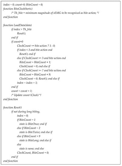 The frequency (BiteClock (hertz)) for detecting the biting operation was set to 20 Hz, which was 10% of the sampling frequency of the EOG signal. That is, the LoadData function was called every 20 rising edges per second. At that time, if the magnitude of the sEMG signal exceeded the predetermined threshold value (Th_bite), it was considered that this was the beginning time of the biting operation, and this point was set as the starting point of the window. The size of the window to determine the types of the biting operation was set to 0.5 s, which was the time when the rising edge was called 10 times in the clock signal. As shown in Figure 10, if the biting was ended at the moment when the ClockCount was 3 or more and 7 or less, the BiteCount was increased. At this time, if the BiteCount was 1, it was classified as the ‘bite once’ input and sent to the keyboard, and if the BiteCount was 2, it was classified as the ‘bite twice’ input. If the BiteCount value was more than 7, it was classified as the ‘bite long’ input and transmitted to the keyboard.