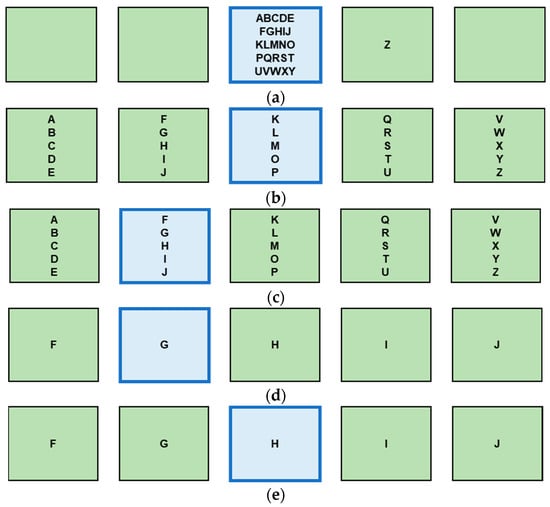 Figure 11 shows an example key typing sequence of a specific character (here ‘H’) using the designed virtual keyboard. Here, when the user was currently looking at a specific block among the five blocks, the corresponding block was displayed in light blue. If the middle block was selected, as shown in Figure 11a, the letters in this block were split into 5 blocks, as shown in Figure 11b. Here, when the user selected a block where the character to be selected was as shown in Figure 11c, they were split again as shown in Figure 11d, and finally one could select the desired block as shown in Figure 11e to select the letter. To type the corresponding letter, you only needed to bite once. After typing of a single character, the interface went back to that shown in Figure 11a. Here, the interface method may be considered complicated by expressing an additional figure to explain the block division process for character selection. However, since these operations were performed continuously, the typing speed was faster than that of a general matrix-type virtual keyboard [11] which used simple up/down/right/left commands. Quick correction was possible through the biting action.