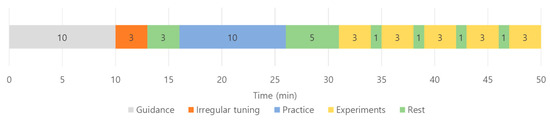After the practice, the subjects typed the ‘hello world’ sentence (consisting of a total of 11 characters including space) a total of 5 times. At this time, in addition to the subject’s bio-signal, eye movements and biting motions were recorded as images through a camera and used for analysis later. The time required for the experiment varied depending on the subject’s adaptation speed and error rate, and bio-signal data were collected for at least 100 eye movements and 165 biting actions per subject. The typical flow of the experiment is shown in Figure 13. The time required for the sentence input experiment indicated in yellow was approximately 2 to 3 min.