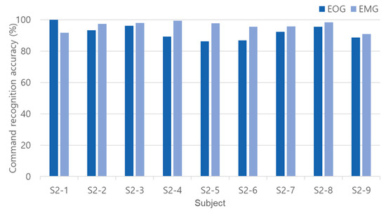 For the performance evaluation, the eye gaze position recognition rate through the EOG signal and the click, delete, and backspace command recognition rate through the sEMG were calculated, and are shown in Figure 14 and Table 1. In the accuracy calculation, cases where the eye movement or biting motion occurred but was not recognized for interface input and cases where the input motion was incorrectly recognized as another motions were included in the errors. The recognition accuracy of the EOG signal was at least 86.32% and the maximum was 100%, and the average recognition accuracy was 92.04%. Participation in the first experiment (S1) did not appear to affect the recognition accuracy of this experiment (S2). For example, S2-8, who participated in S1, showed a high recognition accuracy of 95.54%, but S2-4 and S2-6, who also participated in S1, showed a relatively low recognition accuracy. On the other hand, S2-1 and S2-3 participated in the experiment for the first time, but showed very high recognition accuracy of 100% and 96.18%.